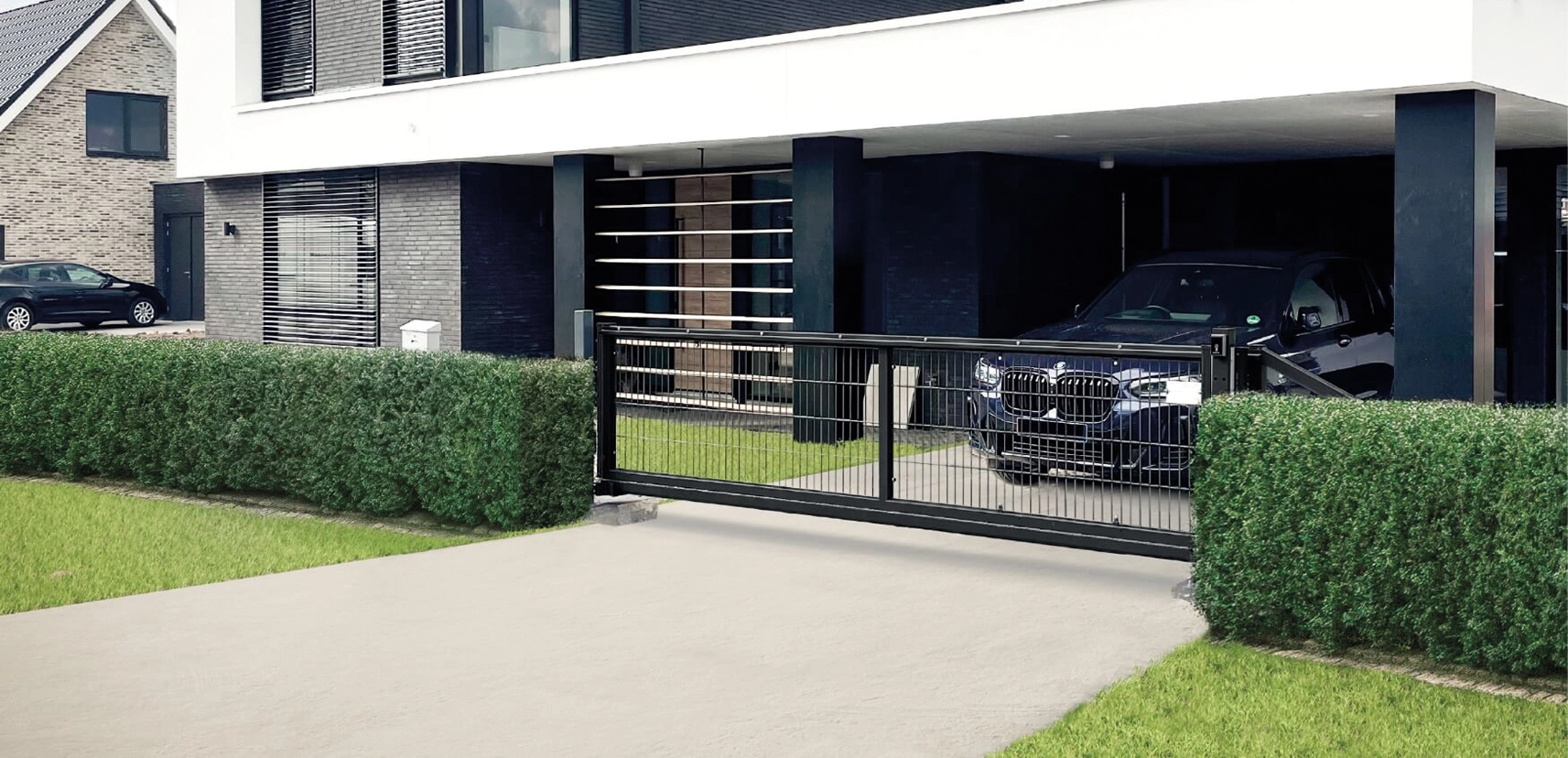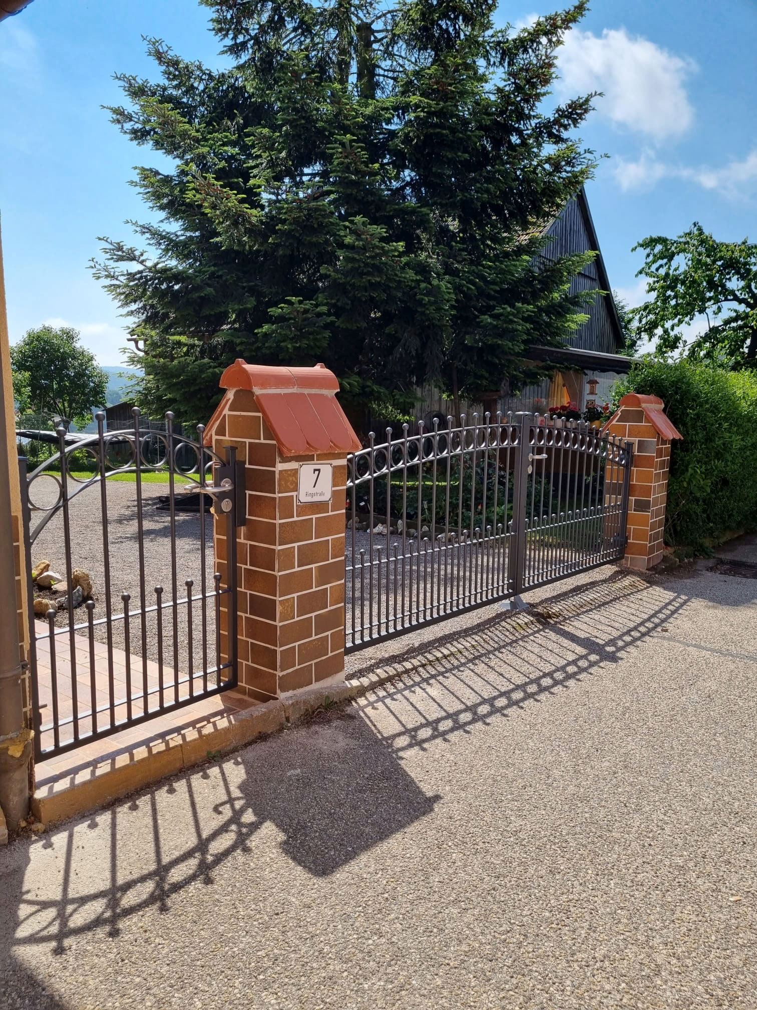 Ergänzt wird unser Angebot durch passgenaue Gartenpforten, stabile Drehflügeltore, freitragende Schiebetore – auf Wunsch mit elektrischem Antrieb – sowie professionelle Sicherheitszaunsysteme und umfangreiches Montagezubehör. Alle Komponenten sind optimal aufeinander abgestimmt und sorgen für ein langlebiges, sicheres Gesamtbild.